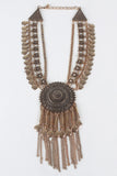 This statement necklace features bronze-tone chains, geo shape pendants, small etched medallions, chain fringe, and adjustable lobster hook closure.