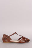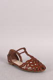 This flat is dorsay silhouette, featuring cutouts along the vamp and rear back. Finished with a t-strap and an adjustable ankle strap.