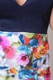 This combo dress features a plunging v-neckline, spaghetti shoulder straps, crisscross back, hidden zipper back, contrasting vibrant floral bottom half with a high waisted seam. Accessories sold separately. Made in U.S.A. 95% Polyester, 5% Spandex.