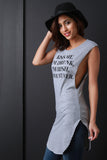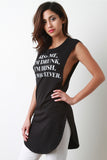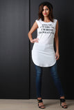 This top features a jersey knit fabrication, round neckline, sleeveless construction with dropped arm holes, and a round hemline. Finished with a print that reads, "KISS ME, I'M DRUNK,I'M IRISH, OR WHATEVER." Accessories sold separately. Made in U.S.A. 96% Polyester, 4% Spandex.