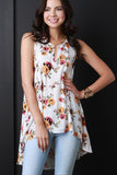 This casual top features a lightweight floral print fabrication, round neckline, sleeveless, keyhole detail, raw edge princess seams, flowy fit and a high low hem. Accessories sold separately. Made in U.S.A. 100% Rayon.
