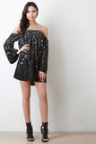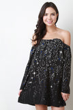 This shift dress features an off the shoulder neckline with boning, smooth fabrication with galaxy night theme print, long bell sleeves and finished with a back hidden zipper closure. Accessories sold separately. Shell 1: 100% Polyester, Shell 2: 74% Polyester, 24% Rayon, 2% Spandex.