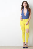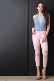 This vegan suede bodysuit features a deep v-neckline, self-tie halter neckline, open back, high waisted cinched seam, brief bottom, and a double snap button closure at crotch. Accessories sold separately. Made in U.S.A. 90% Polyester, 10% Spandex.