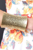 This beautiful cuff bracelet features burnished metallic frame with embossed filigree pattern throughout, flared construction, and open ends for easy on/off.