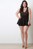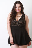 This plus size romper features a floral lace top, v-neckline, and sleeveless design. Bottom features smooth fabric pleated skirt with shorts under layer. Accessories sold separately. Made in USA. Self: 90% Nylon, 10% Spandex. Contrast : 90% Polyester 10% Spandex.