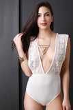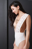 This bodysuit features a deep v-neckline, floral embroider semi-sheer mesh fabrication with scallop trimming, self-tie bow at nape, high waisted seam to a contrasting brief bottom, and double snap button closure at nape. Accessories sold separately. Made in U.S.A. 95% Polyester, 5% Spandex.