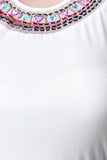 This plus size fit & flare dress features a round neckline, contrast mesh with a beautiful beadwork embroidery design, short sleeves construction, cinched waistline, and flare skirt. Accessories sold separately. Made in U.S.A. Self: 95% Polyester, 5% Spandex. Contrast: 90% Nylon, 10% Spandex.