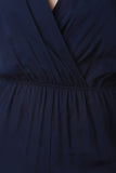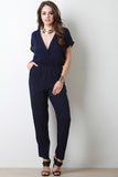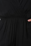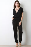 This jumpsuit features a solid knit fabrication, surplice neckline, cinched waistline, slanted side pockets, and taper cut pants. Accessories sold separately. 100% Polyester.