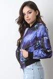 This eye-catching bomber print , left arm zipper pocket, and two snap button pockets. Finished with lining. Accessories sold separately. 100% Polyester.